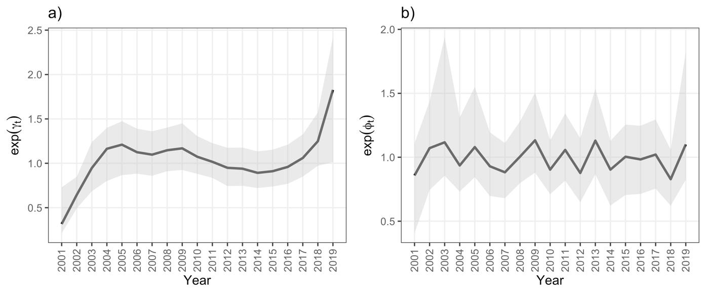 time effects, respectively, reported on the natural scale, i.e. exponentiating. We also reported the 95 % highest posterior density interval (HPDI) for both quantities. Figure 3a shows that the structured effects from 2001 to 2005 increased. After that, the trend was stable for ten years, marginally declining, but from 2015 to 2019, a new incremental trend was visible. The increment from 2001 to 2019 of the structured effects was 42.2 %. It would be essential to confirm this alarm signal in the future; we know that climate change and global warming are affecting wildfire patterns in some regions, perhaps locally incrementing the occurrence throughout space and time. According to projections of Senande-Rivera et al. (2022), the global area with frequent fire-prone conditions will increase by 29 % (25 % in temperate zones) at the end of the 21st century. An effect of the increase in forest fires in the future may be to raise the loss of cover in forest areas altering the hydrological processes (Ruíz-García et al., 2022), besides social and environmental impacts. On the other hand, the unstructured effect term (Figure 3b) displayed some fluctuation around one, as was expected because this term represents the temporal variation (residual) not explained by the model.