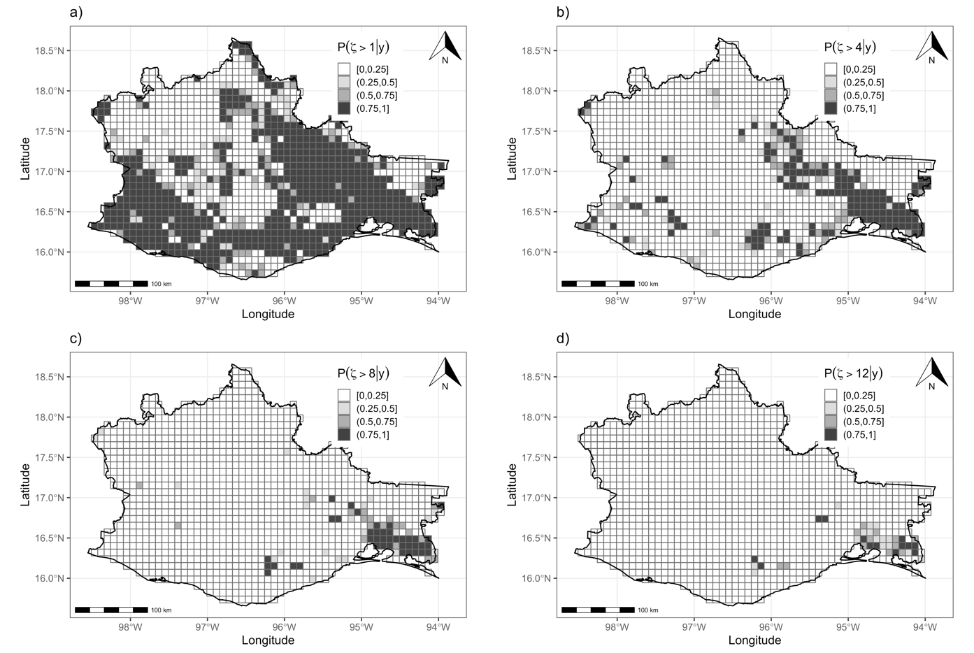 . Note that almost half of the state has a probability greater than 0.75 (75 % of chance) of having at least two hotspot events in a year (Figure 4a). In the most extreme cases, there are few cells located in the Isthmus of Tehuantepec that have at least a 0.75 probability of exceeding 12 events per year (Figure 4d).