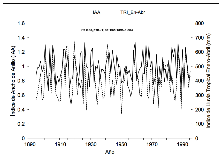Al analizar el impacto del ENSO en el CPO, se determinó una relación estrecha, pero negativa con SOI reconstruido (noviembre-febrero), así como con el SOI instrumental del período mayo-diciembre. Esta relación, entre la cronología e índices de ENSO mejoró, cuando se utilizó el TRI de enero-abril (r= 0.53, p<0.0001, n= 103 años) (Figura 4); lo que sugiere que el crecimiento de los árboles en esa región, puede explicar 27 % de la variabilidad de las anomalías de precipitación producidas por ENSO durante las estaciones invierno-primavera.