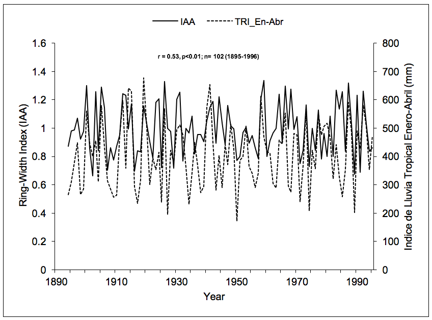 The analysis of the impact of ENSO on CPO determined a close but negative relationship with the reconstructed (November-February) SOI, as well as with the instrumental SOI for May-December. This relationship between the chronology and the ENSO indexes improved when the January-April TRI (r= 0.53, p<0.0001, n= 103 years) was utilized (Figure 4). This suggests that the growth of the trees in that region may account for 27 % of the variability of the precipitation anomalies produced by ENSO during the winter-spring seasons.