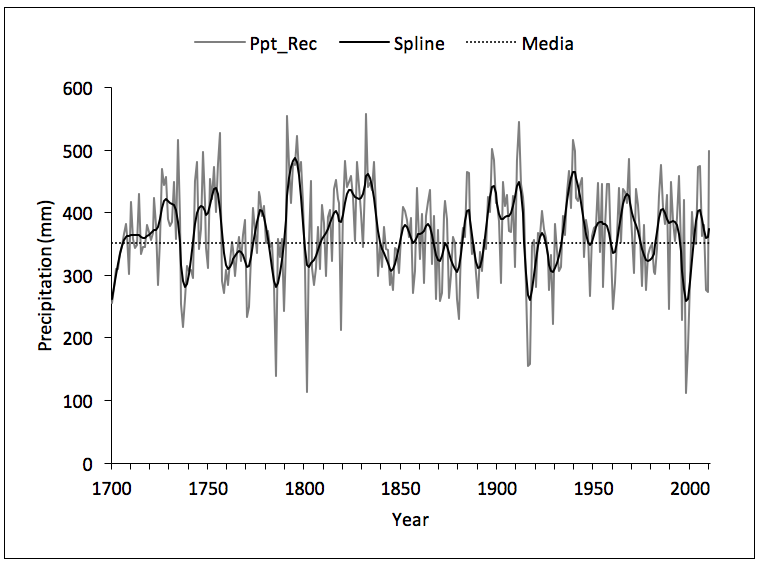 In the 311 years of reconstructed rainfall, the driest years were 1785 (139 mm), 1801 (114 mm) and 1998 (112 mm, with a precipitation below 40 % of the average recorded for January-September (352 mm). These years of rain scarcity were observed to occur in periods with several consecutive years of drought, which caused an economic crisis and brought about social issues across the country, as in the “Year of the Famine” (Florescano, 1980). The period between 1789 and 1810 has been well documented in Saltillo, Coahuila, for its shortage of basic grains, famine and high mortality of the livestock (García, 1997).