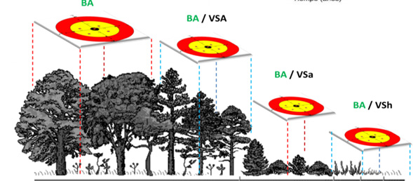 En los trabajos de Specht, la CPF de la comunidad de plantas se divide en un estrato superior o ES (cobertura proyectiva del follaje=CPFES) e inferior o EI (cobertura proyectiva del follaje=CPFEI). Para comunidades dominadas por especies arbóreas, la distinción de estratos es una altura de dos metros (Specht y Morgan, 1981; Specht y Specht, 1993; Specht y Tyler, 2010). En el caso de matorrales, pastizales y cultivos, para la separación entre el estrato superior e inferior se utilizan alturas que reflejen la partición de recursos en la comunidad (Specht y Morgan, 1981).