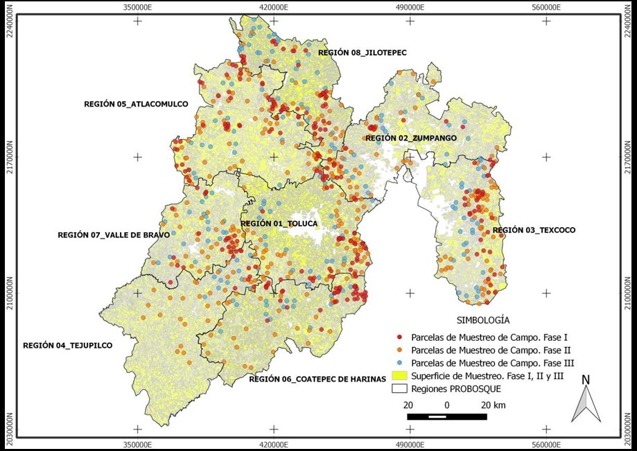 Se establecieron aleatoriamente sitios de muestreo de 1 000 m2. En el Cuadro 1 se presenta el número de sitios medidos en cada fase de la campaña, con un total de 682. El tamaño de la muestra se estimó con base en el protocolo para calcular el número de puntos de muestro usado en los proyectos de Mecanismos de Desarrollo Limpio para Forestación/Reforestación (A/R CMD project activity, por sus siglas en inglés) de la Convención Marco de Naciones Unidas para el Cambio Climático (UNFCCC, por sus siglas en inglés), mediante la herramienta metodológica A/R CDM Tool (2014), desarrollada por Winrock International (Pearson et al., 2005). Los sitios se distribuyeron en función de las regiones en que la Protectora de Bosques del Estado de México (Probosque) divide a la entidad. El uso de la fase de muestreo permite analizar la vegetación por dominancia del estado de sucesión secundaria.