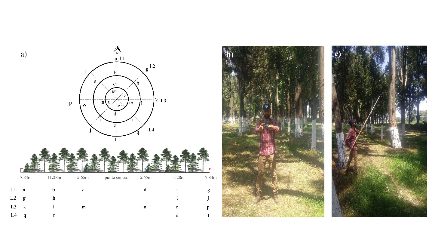 La cobertura proyectiva foliar (CPF) se evaluó con el método desarrollado por Salas-Aguilar et al.(2017) para la estimación de la fracción de la cubierta forestal con el uso de fotografía digital: las imágenes se tomaron con una cámara Canon® Eos Rebeld T5 configurada con la máxima resolución espacial (17 915 904 pixeles). El lente de la cámara se ajustó a un ISO de 200, la apertura y la exposición se utilizaron en modo automático. Para la captura de la fotografía, el lente se niveló hacia arriba a 1.5 m de altura con respecto al suelo, en los radios de 17.84, 11.28 y 5.65 m, respectivamente, y en el sentido de las manecillas del reloj: de norte a sur, de noreste a suroeste, de este a oeste y de sureste a noroeste (Figura 3).