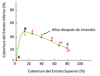 La relación entre la riqueza de especies del estrato inferior (SEI) es lineal e inversamente proporcional a CPFES (Specht y Morgan, 1981; Specht et al., 2006). Este patrón se observa en la sucesión pírica de una comunidad vegetal (Specht y Jones, 1971) (Figura 4), lo que muestra que cuando el bosque tiende a su madurez, la diversidad de especies del EI disminuye y la del ES aumenta.
