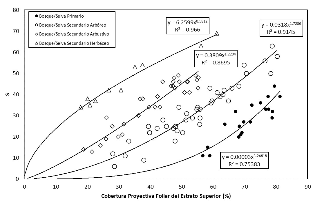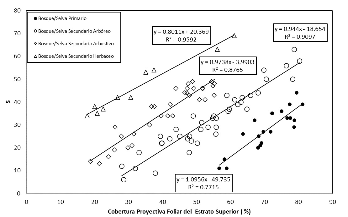 En la Figura 5 se muestran los resultados obtenidos para el caso de bosques/selvas y sus estados de sucesión. La relación entre S y la CPF del estrato superior se ajustó a un modelo lineal: