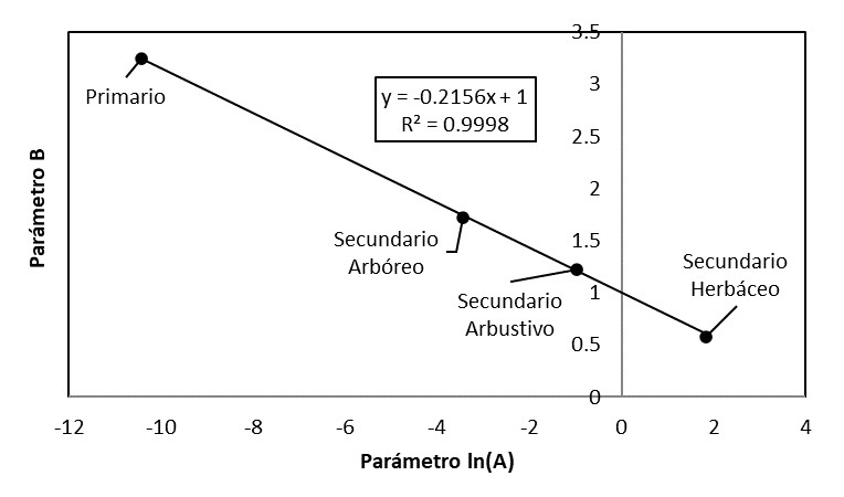 Al realizar un análisis con el modelo potencial S=A(CPFES)B, se observó que los parametros ln(A) y B están relacionados entre sí, ya que se interceptan en un punto común (0,1). En la Figura 7 se presenta la relación entre los parámetros de los modelos potenciales ajustados en la Figura 6; la línea recta pasa por el punto (0,1), dado que ln(A=1)=0 en el caso de B=1. Así, la relación entre los parámetros de los modelos potenciales requiere solo de conocer un dato para establecer las relaciones de los diferentes estados de la sucesión de bosques/selvas.