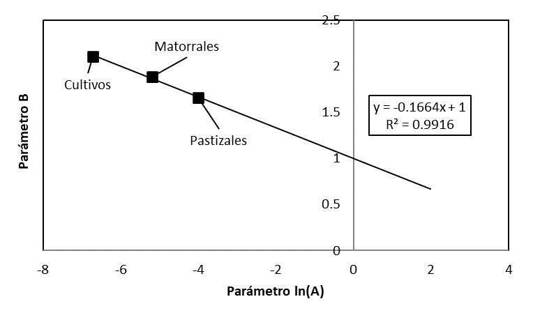 Figura 11. Relacion entre los parámetos de los modelos potenciales para matorrales, pastizales y cultivos agrícolas.