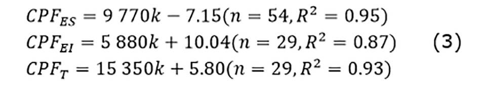 Dado que se esperaba una relación no lineal entre CPFES–k, relaciones (3) y (4), en la Figura 6 se observan las relaciones que se establecieron mediante modelos potenciales.
