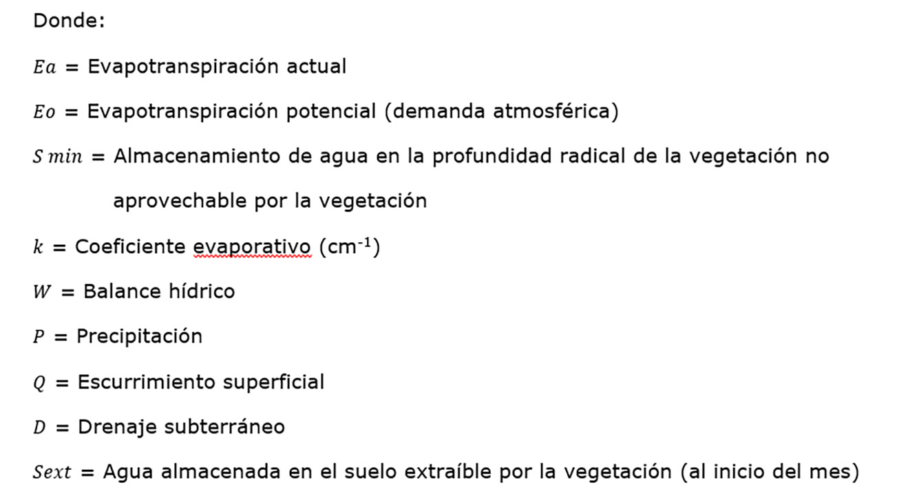 El valor del agua almacenada en el suelo (Smax) es el agua entre el valor de capacidad de campo y el punto de marchitamiento permanente. La precipitación (P) en exceso de Smax se pierde como drenaje subterráneo (D). El balance hídrico (Ecuación 1) se realiza a escala de parcela; sus valores corresponden a datos mensuales y sus unidades son cm.