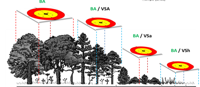 The red and yellow circles represent the sampling sites in a fir (Abies spp.) forest at different stages of succession. BA = Primary fir forest; BA/VSA = Fir forest with secondary arboreal vegetation; BA/VSa = Fir forest with secondary shrub vegetation; BA/VSh = Fir forest with secondary herbaceous vegetation.