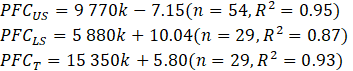 Given that a nonlinear relationship between PFCUS-k, relationships (3) and (4) were expected, Figure 6 shows the relationships established by potential models.