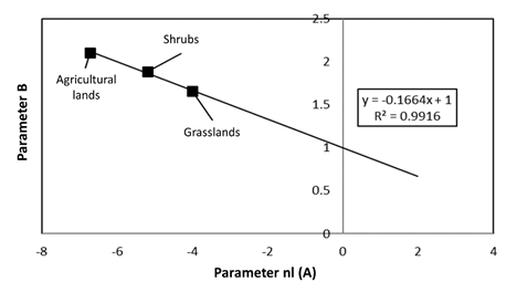 Figure 11 shows the relationship between the parameters of the potential models fitted for the relationship of S to PFCLS for shrubs, grasslands, and agricultural lands which, in a similar way to forests/rainforest, were fitted to a straight line passing through the point (0,1).