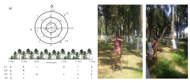Figure 3. Photographic capture process at the sampling sites: a) PMCB design: the letters correspond to the distance of the capture from the center of the sampling site, b) Photographic capture at zenith, c) Photographic capture at nadir.
