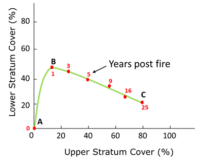 The relationship between species richness of the lower stratum (SLS) is linear and inversely proportional to PFCUS (Specht and Morgan, 1981; Specht et al., 2006). This pattern is observed in the post-fire succession of a plant community (Specht and Jones, 1971) (Figure 4), which shows that, as the forest tends to mature, the species diversity of the LS decreases and that of the US increases.