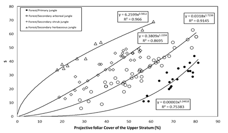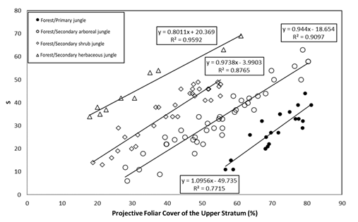 Figure 5 shows the results obtained for forests/rainforest and their succession stages. The relationship between S and the PFC of the upper stratum was fitted to a linear model: