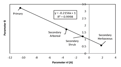 Figure 7. Relationship between the parameters of the potential models for forests/rainforest and their succession stages.