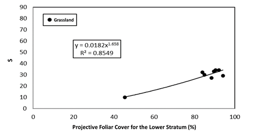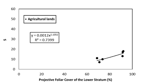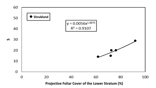 For non-forest/forest vegetation, the number of plots sampled was limited. Figure 8 shows the relationship between PFCLS and S in the case of shrublands.