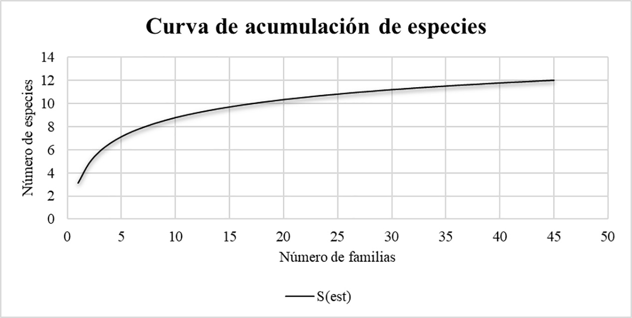 La curva de acumulación de especies muestra que conforme se realizó la encuesta y se registraron los taxa, esta aumentó en los primeros hogares y después se estabilizó, hasta llegar a un punto asintótico (Figura 1); ello concuerda con lo propuesto por Álvarez et al. (2006), quienes citan que cuando una curva de acumulación es asintótica, aunque se aumente el número de unidades de muestreo o de individuos censados, es decir, se incremente el esfuerzo, el número de especies no será mayor.