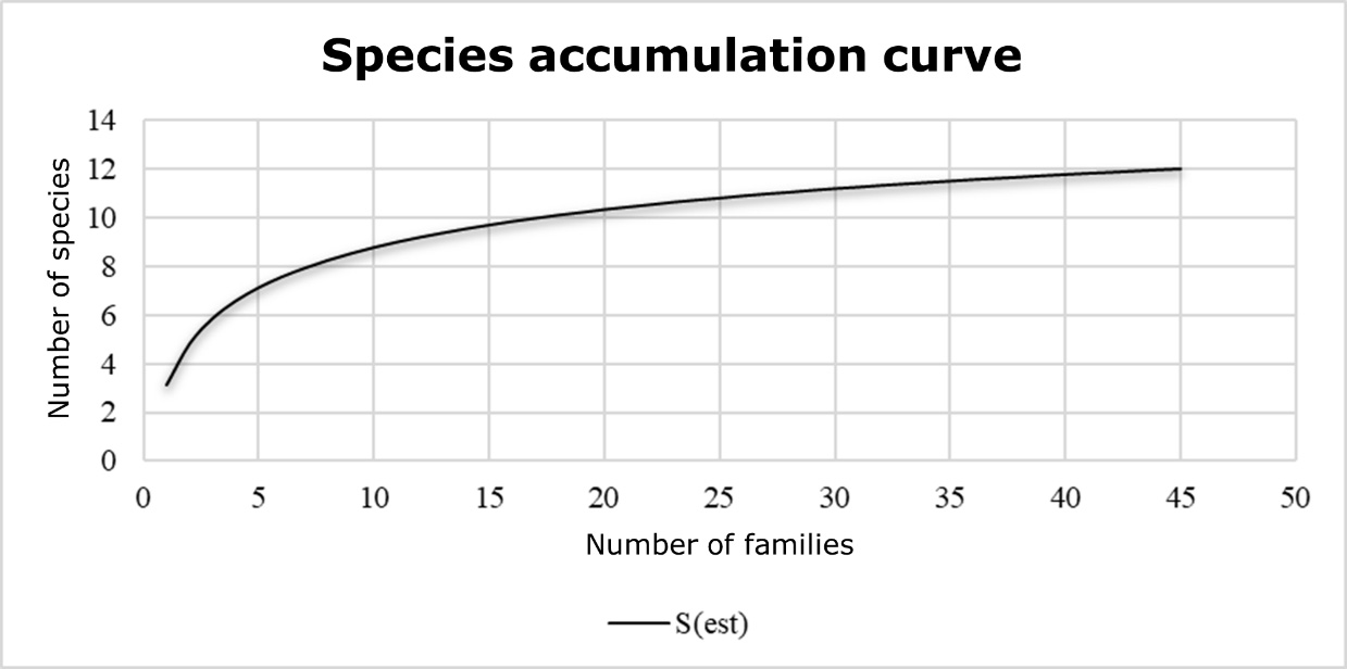 The species accumulation curve shows that as the survey was carried out and the taxa were recorded, it increased in the first homes and then stabilized, until reaching an asymptotic point (Figure 1). This agrees with what was proposed by Álvarez et al. (2006), who cite that when an accumulation curve is asymptotic, even if the number of sampling units or individuals registered is increased, that is to say, the effort is increased, the number of species will not be greater.