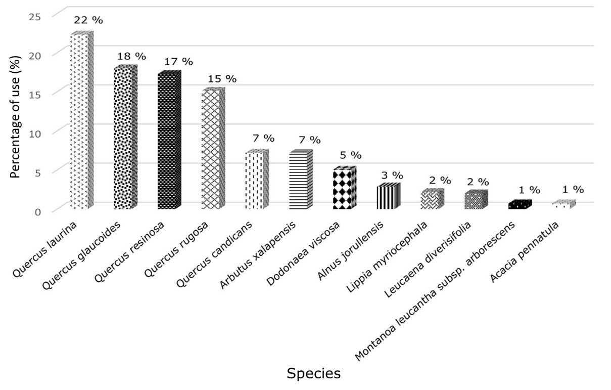 Among the families surveyed, the most used fuels are: white oak (Quercus laurina Bonpl.) with 22 %, followed by black oak (Quercus glaucoides M. Martens & Galeotti) with 18 % and yegareche oak (Quercus resinosa Liebm.) with 17 % (Figure 2). In general, the genus Quercus has a frequency of use of 79 %, and 21 % corresponds to other broadleafs.