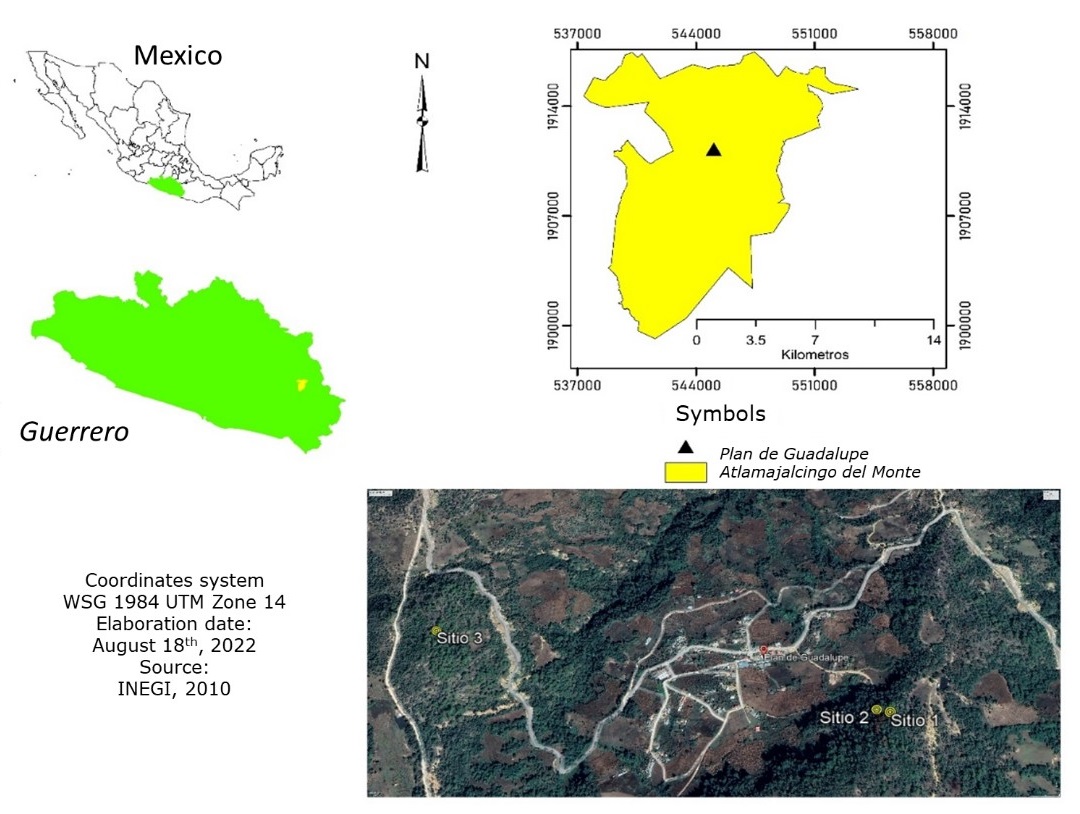 Plan de Guadalupe belongs to the La Montaña region; It is located at 2 050 masl, between 17°10' and 17°21' N, 98°30' and 98°39' W; it is bordered to the north by Malinaltepec, Copanatoyac and Xalpatláhuac municipalities, to the east by Xalpatláhuac and Metlatónoc, to the south by Metlatónoc and Malinaltepec, and to the west by Malinaltepec and Copanatoyac (Inegi, 2022) (Figure 1).