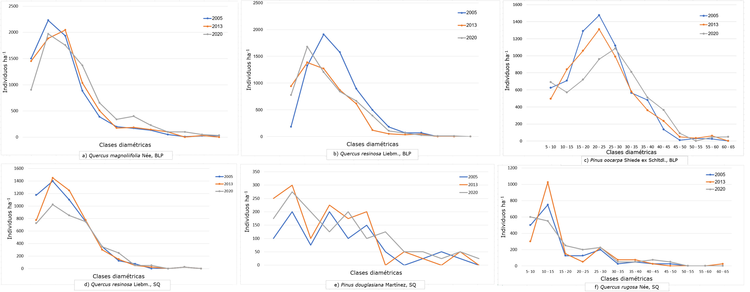 En el caso de P. oocarpa en el BLP, la categoría diamétrica con más individuos fue de 10-15 cm en los años 2005 y 2013, pero en el año 2020 correspondió a la clase 25-30 cm (Figura 2c). Esta tendencia coincidió con una disminución en el número de individuos de la categoría diamétrica 10-15, de 1 310 individuos ha-1 en el año 2013 a 960 individuos ha-1 en 2020. P. douglasiana en SQ evidenció una estructura dispersa debido a que hay disminución de individuos para las categorías diamétricas 15-20, 25-30 y 30-35 cm de dn en los diferentes periodos (Figura 2e)