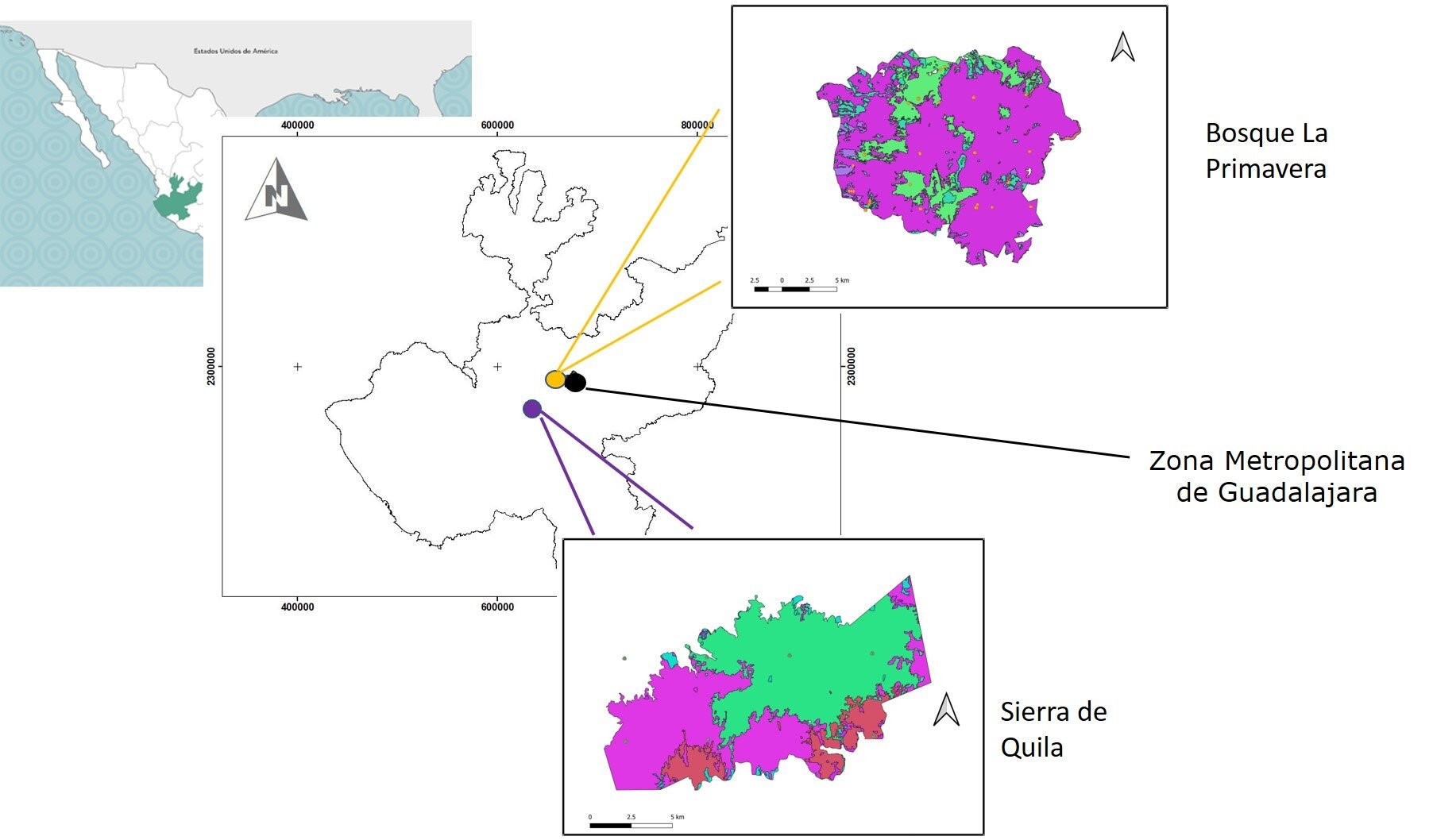 El APFF Sierra de Quila (SQ) se localiza a 100 km de la ZMG. A pesar de haberse decretado en 1982, a la fecha aún no tiene un programa de manejo publicado, por lo que también solo se realizan actividades de protección (Conanp, 2022). Además, se desconoce de manera cuantitativa el impacto de los disturbios naturales y antrópicos en las comunidades forestales de ambas APFF.