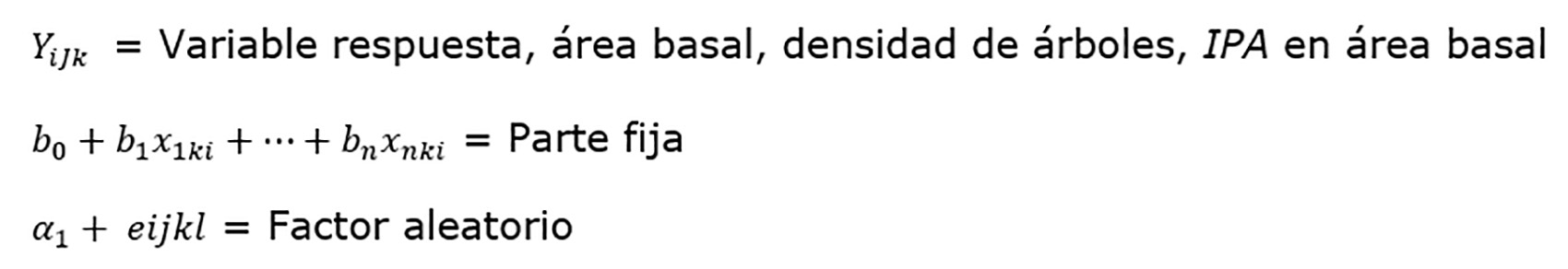 Mediante un modelo lineal mixto bajo el enfoque de medidas repetidas, se estableció la relación entre las variables dependientes área basal, densidad de árboles e incremento periódico anual en área basal, con los factores año de medición, área natural protegida y tipo de vegetación. Dado que, en algunos casos, los sitios de muestreo están contenidos en un conglomerado se decidió el uso de modelos lineales mixtos con intercepto aleatorio. La estructura del modelo fue: