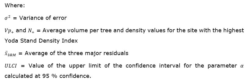 With the values of the parameters of the best fit technique, the self-thinning line was delimited for P. montezumae in the study area, which corresponds to the largest average volume per tree that a hectare can support without self-thinning and is equivalent to 100 % of the Yoda stand density index (YSDI) (Santiago-García et al., 2013). A reference density (Nr) of 100 trees ha-1 was determined in order to calculate the YSDI. The YSDI is estimated by algebraically manipulating the linearized Yoda equation and applying the exponential function () as the inverse of the natural logarithm; the nonlinear mathematical structure of this index is represented by the expression (7).