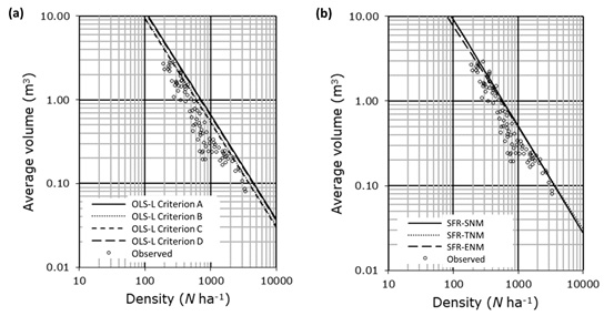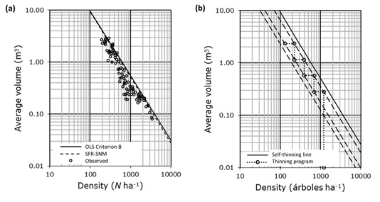 In a second phase, a comparative graphical analysis based on Salas-Eljatib and Weiskittel (2018) was carried out between the self-thinning lines generated by each of the techniques (between criteria for increasing with OLS and between the fitting modalities with SFR). In addition, the location and trajectories of the self-thinning lines were inspected and contrasted with the observed data.