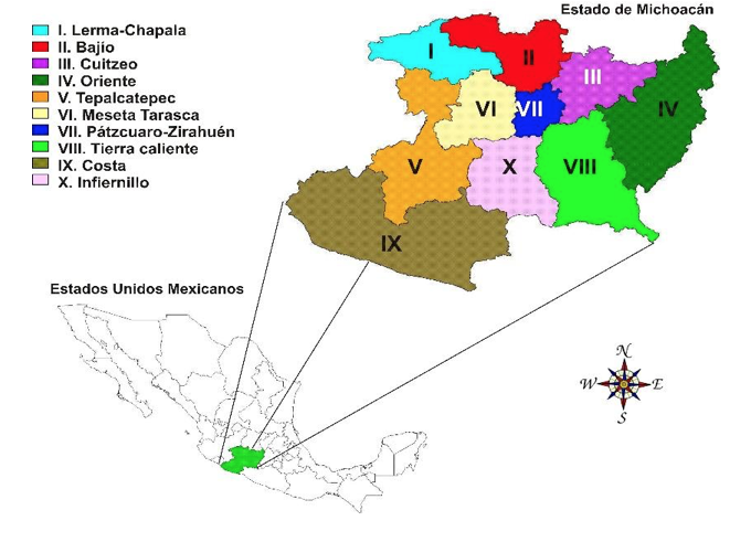 Description of the study area. The state of Michoacán is located in the western portion of the country, between the coordinates 20°23’43’’ - 18°09’ 47’’ N and 100°04’45’’ - 103°44’49’’ W, has a territory of 59 864 km2, formed by 113 municipalities. The Comisión Forestal del Estado de Michoacán (Forestry Commission of the State of Michoacán) (Cofom) divides it into 10 forest regions (Figure 1): I Lerma-Chapala, II Bajío, III Cuitzeo, IV Oriente, V Tepalcatepec, VI Meseta Purépecha, VII Pátzcuaro-Zirahuen, VIII Tierra Caliente, IX Sierra Costa and X Infiernillo (Table 1) (Cofom, 2014).