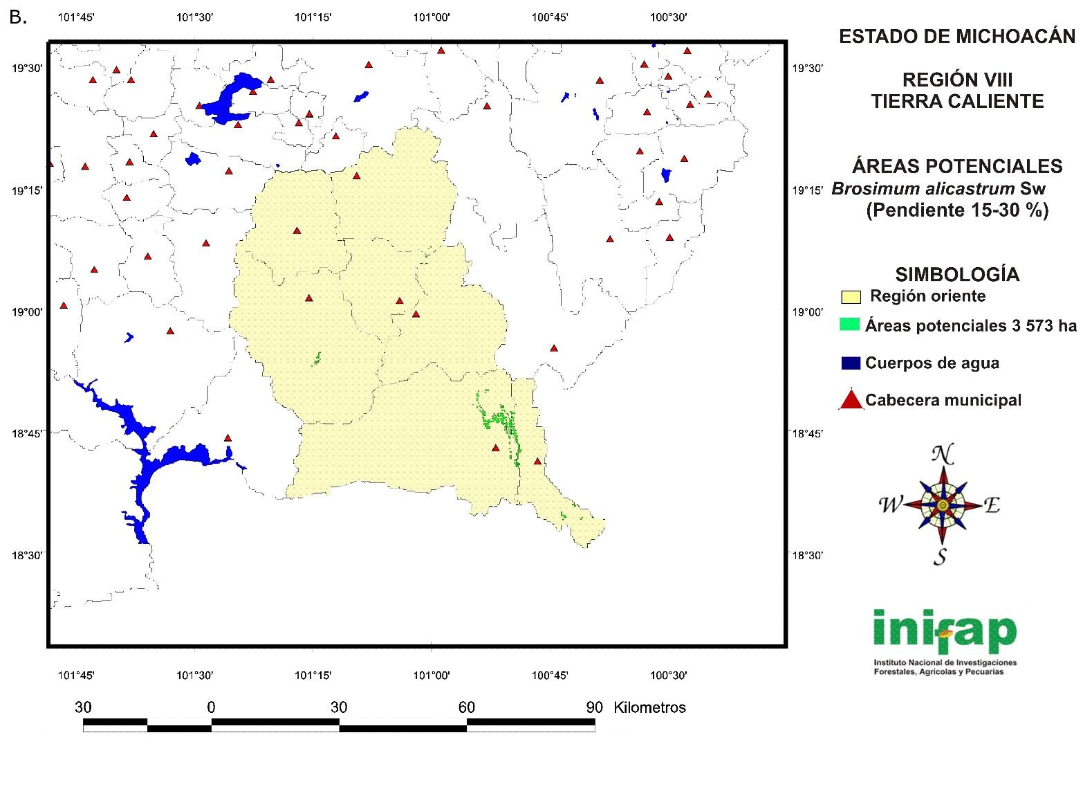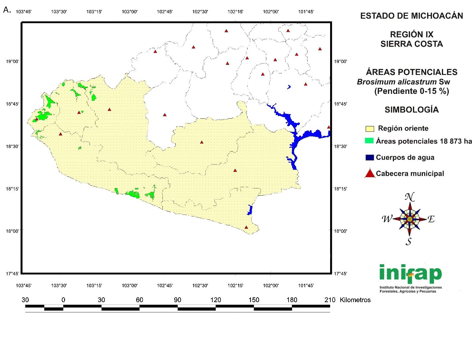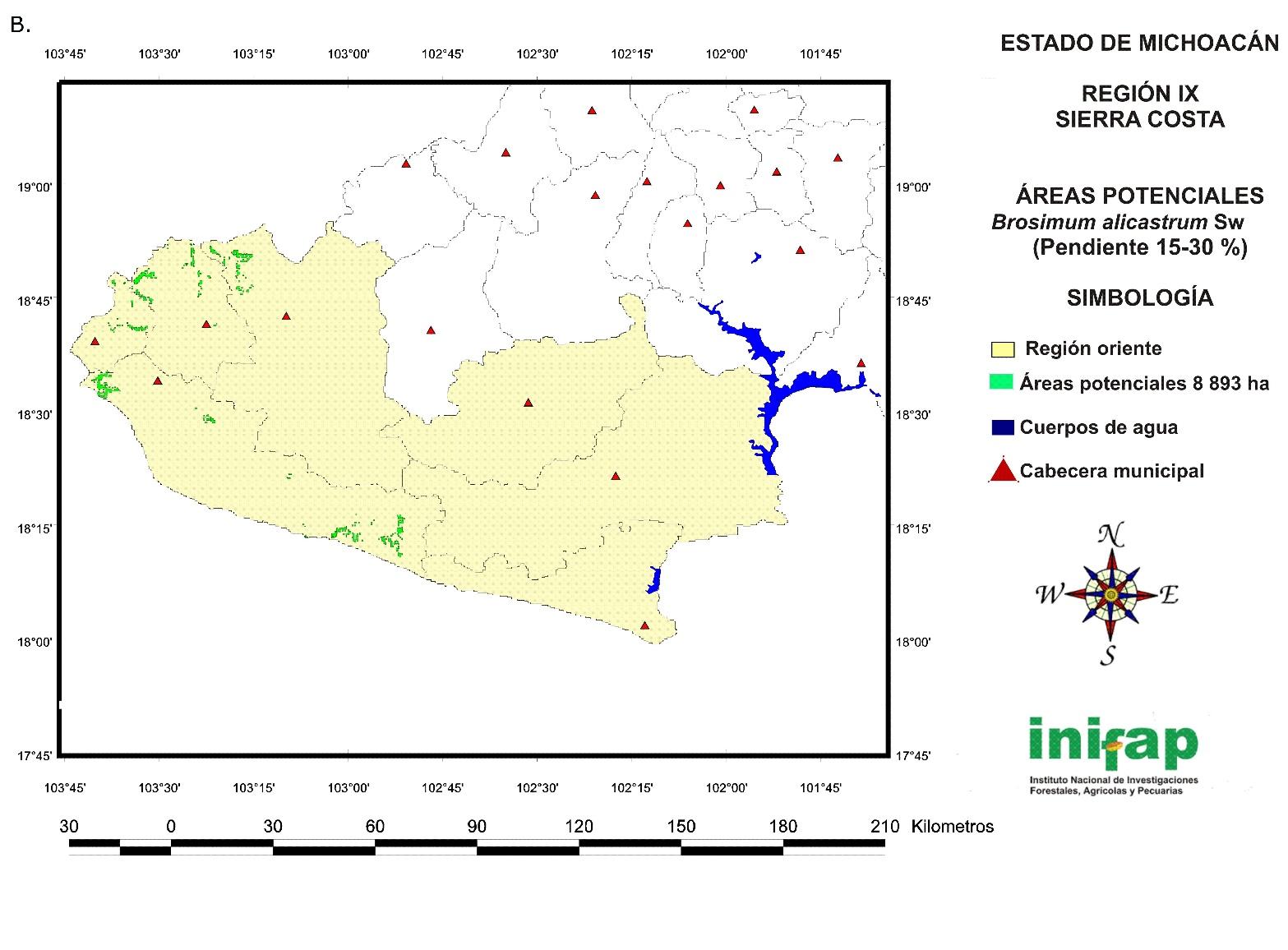 The potential areas for the establishment of non-mechanized or manual plantations of B. alicastrum at a state level in sites with a 15-30 % slope cover a total surface of 14 721 ha (Figure 7) and are located in the following regions: IV Oriente (778 ha), V Tepalcatepec (829 ha), VIII Tierra Caliente (3 573 ha), IX Sierra Costa (8 893 ha) and X Infiernillo (648 ha).