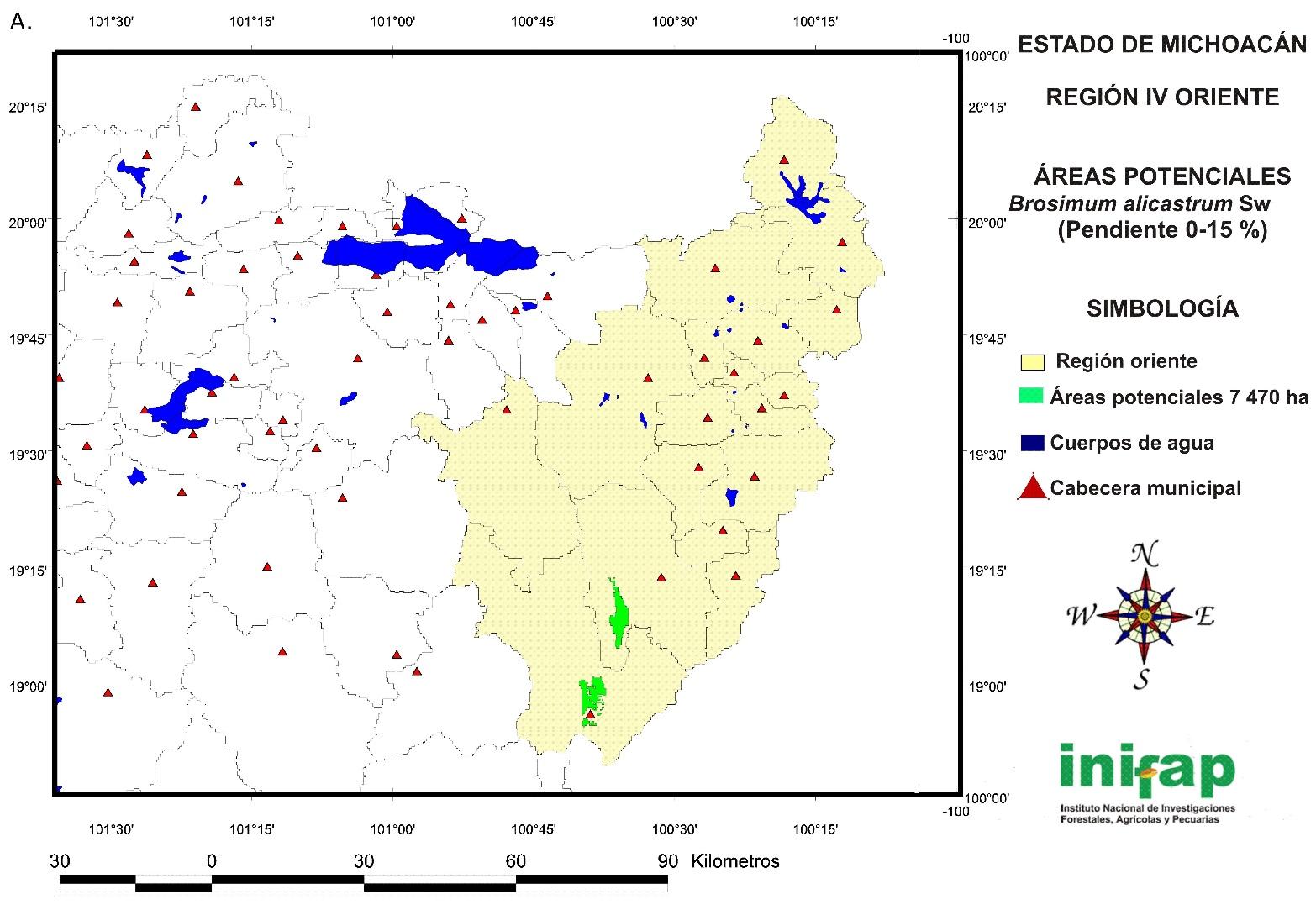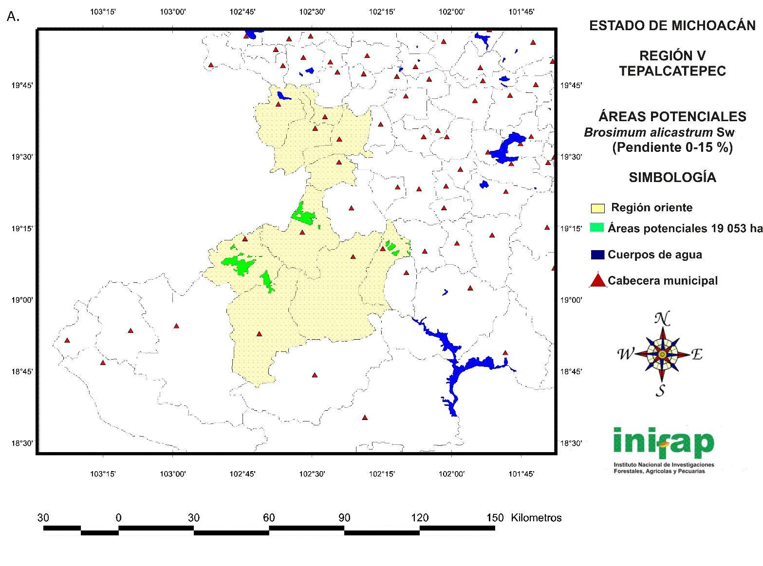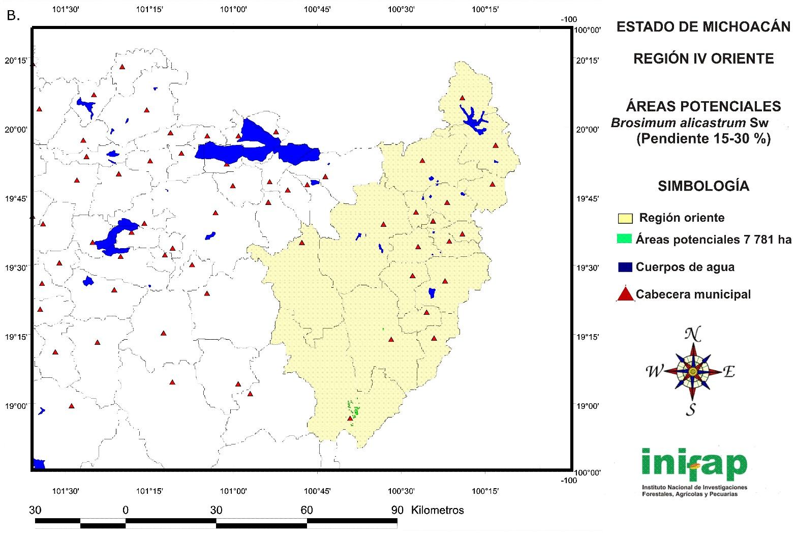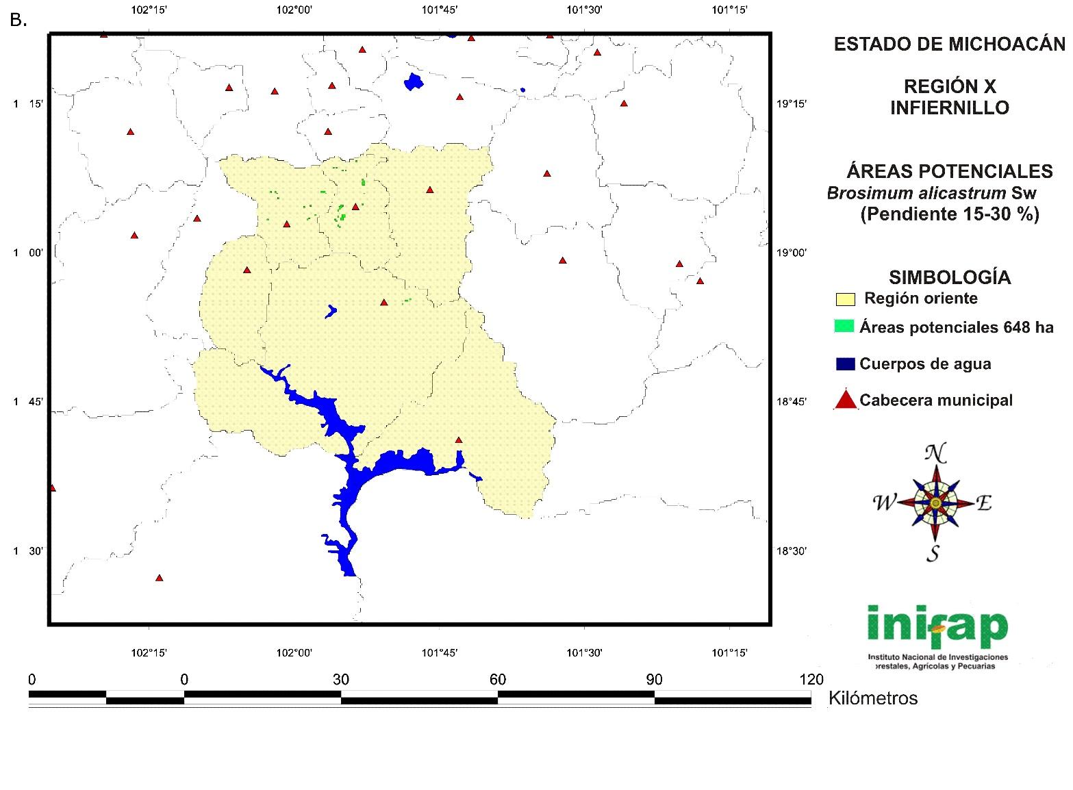 The potential areas for the establishment of non-mechanized or manual plantations of B. alicastrum at a state level in sites with a 15-30 % slope cover a total surface of 14 721 ha (Figure 7) and are located in the following regions: IV Oriente (778 ha), V Tepalcatepec (829 ha), VIII Tierra Caliente (3 573 ha), IX Sierra Costa (8 893 ha) and X Infiernillo (648 ha).