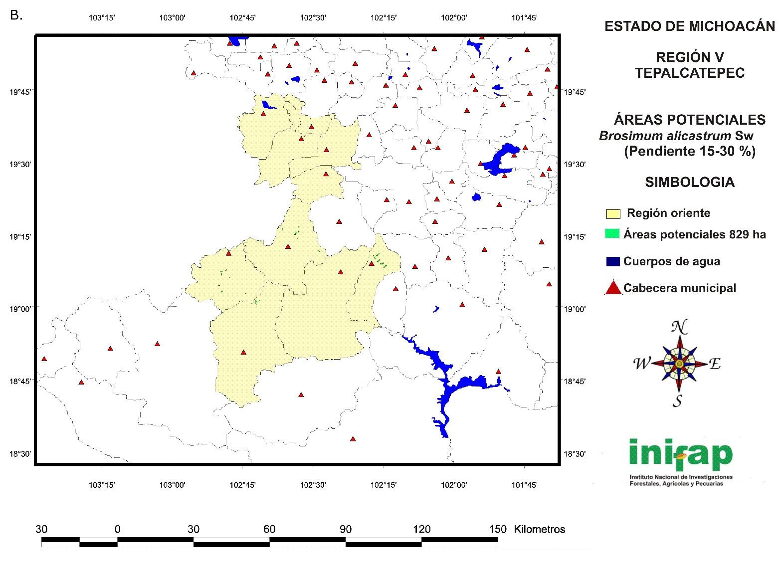 The total surface with a potential for the reestablishment of B. aliastrum plantations with restoration purposes in the state of Michoacán is 86 408 ha; from these, 71 687 ha correspond to 0-15 % slopes, and 14 721 ha, to 15-30 % slopes, distributed in the following regions: IV Oriente, V Tepalcatepec, VIII Tierra Caliente, IX Sierra Costa and X Infiernillo. Due to its ecological, geological, physiographic and topographic characteristics, the dry tropic of the entity exhibits favorable conditions for the development of the proposed plantations. The information generated is a guide for decision making in regard to the establishment of restorative forest plantations.