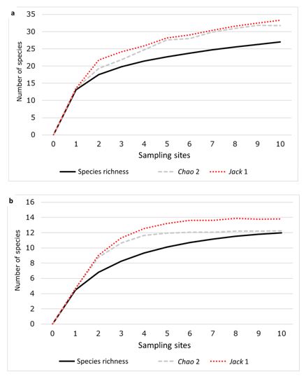 Figure 2. Species accumulation curves with two nonparametric estimators (Chao 2 and Jackknife 1).