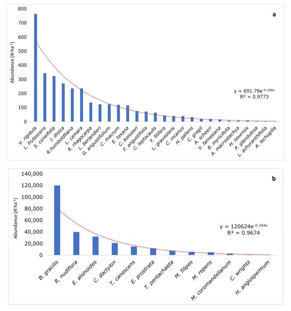 Vachellia rigidula (Fabaceae) was the most abundant species in the tree-shrub stratum, followed by Leucophyllum frutescens (Berland.) I. M. Johnst.(Scrophulariaceae) (Figure 3a). Both taxa are considered pioneers and have a high value of importance in subsequent assessments of different types of exploitation (Patiño-Flores et al.,2022). Furthermore, they are identified as part of the diet of white-tailed deer (Lozano-Cavazos et al.,2020), which contributes to the dispersal processes of these species.