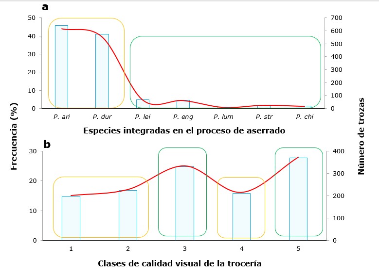 (a) Distribución de especies registradas en el proceso; (b) Distribución de clases de calidad de madera en rollo. Variables dentro de globo común no son significativamente diferentes (p>0.05). P. ari = Pinus arizonica Engelm.; P. dur = Pinus durangensis Martínez; P. lei = Pinus leiophylla Schiede ex Schltdl. & Cham.; P. eng = Pinus engelmannii Carrière; P. lum = Pinus lumholtzii B. L. Rob. & Fernald; P. str = Pinus strobiformis Engelm.; P. chi = Pinus leiophylla Schiede ex Schltdl. & Cham. var. chihuahuana (Engelm.) Shaw.