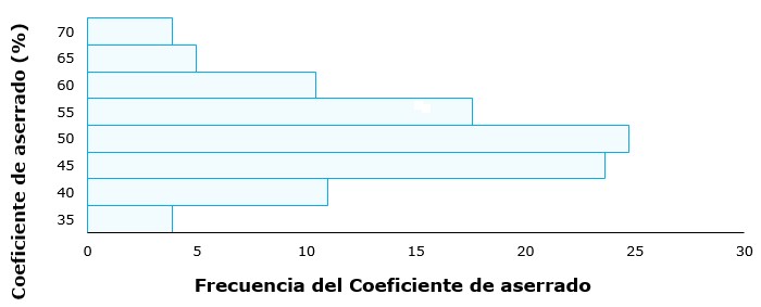 De acuerdo con la Figura 2, se obtuvieron intervalos de rendimiento de aserrado de 35.00 a 70.00 %. Los rendimientos más frecuentes fueron 50.00 y 45.00 %, los extremos (35.00, 65.00 y 70.00 %) representaron la menor frecuencia de aserrado. Esto indica una distribución normal (p>0.05) del Coeficiente de aserrado en las industrias de aserrío del sureste de Chihuahua.