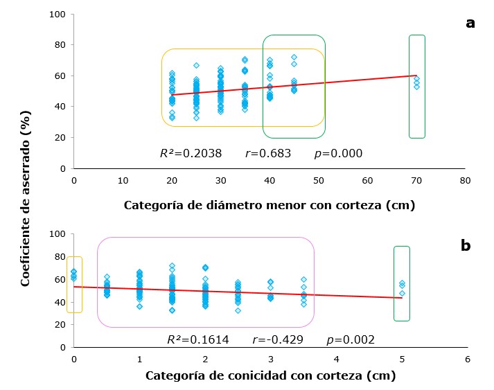 El rendimiento de aserrado presentó diferencias significativas en cuanto a las categorías de diámetro menor con corteza (p<0.05). El rendimiento medio de las categorías de diámetro de 20 a 70 cm no tuvo diferencias significativas. La correlación de Pearson indica que existe una relación positiva entre el diámetro de la trocería y el rendimiento (Figura 3a), lo cual revela que un mayor diámetro incrementará la productividad. En la Figura 3b se muestran diferencias significativas en el rendimiento por categorías de conicidad (p<0.05). La categoría de conicidad de 0 cm registró los rendimientos más altos y son significativamente diferentes a las categorías de 0.5 a 5 cm. La tendencia de los datos y el análisis de correlación de Pearson indicaron que el incremento de la conicidad de la trocería reducirá significativamente el rendimiento de aserrado. El valor r=-0.429 indica un decremento del rendimiento en relación al aumento de la conicidad.