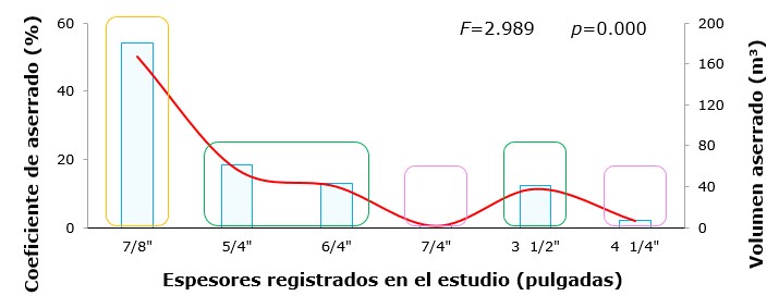 De acuerdo con el análisis de varianza se presentaron diferencias significativas en el rendimiento por grueso nominal de madera aserrada (p<0.05) (Figura 4). La producción de escuadría se concentró, principalmente, en el espesor nominal de 7/8'' (54.12 %), seguido de la madera de 5/4'', 6/4'' y 3 1/2'' que representó un aporte volumétrico similar (p>0.05). La madera de 7/4'' y 4 1/4'' no registraron un rendimiento significativo. Así, por cada metro cúbico de madera en rollo que se asierra, se tiene una producción de 117.26 pt con espesor nominal de 7/8'', 90.05 pt de 5/4'', 6/4'' y 3 1/2'' y solo 5.35 pt para los gruesos de 7/4'' y 4 1/4'' (sin refuerzo).