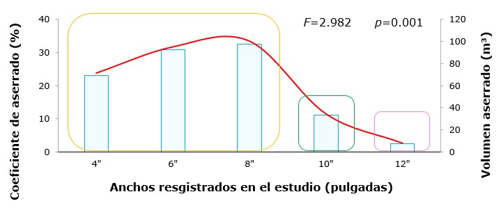 El rendimiento volumétrico por ancho nominal se muestra en la Figura 5; se obtuvieron diferencias significativas (p<0.05) en la distribución de anchos. Las categorías de 4'' a 8'' contribuyeron en una proporción similar en el proceso, con intervalos de rendimiento de 23.10, 30.78 y 32.48 % de la producción (p>0.05). Los anchos de 10'' y 12'' fueron significativamente diferentes (p<0.05). Se estima que por cada metro cúbico de madera en rollo sin corteza resulta una producción de 187.11 pt de 4'', 6'' y 8'' de ancho nominal; la madera de 10'' aporta 24.09 pt y el ancho nominal de 12'' no contribuye significativamente al rendimiento debido a que solo se obtienen 5.46 pt de este producto.