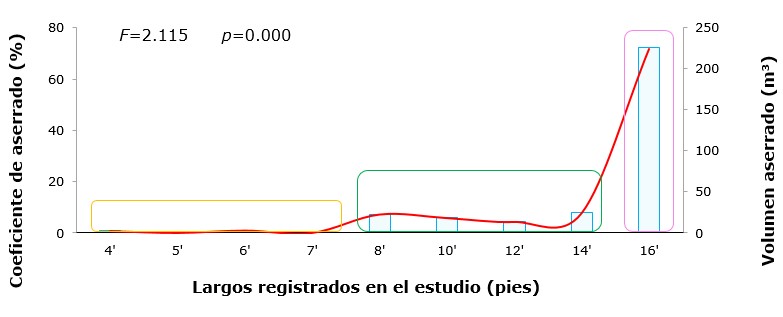 Los resultados indicaron que el rendimiento en el largo nominal presenta diferencias significativas (p<0.05). Los largos de madera aserrada de 4' a 7' correspondieron a las categorías con el menor rendimiento y no fueron significativamente diferentes entre sí (p>0.05). Las clases de largo de 8' a 14' registraron un rendimiento no significativamente diferente (p>0.05). Por último, la madera de 16' de largo fue el principal producto generado, y es la única clase que fue significativamente diferente del resto de clases de largo (p<0.05). En conjunto, la madera de 4' a 7' de largo representa una producción de 4.54 pt por metro cúbico de madera en rollo aserrada, las clases de 8' a 14' de largo tienen una producción de 55.64 pt; la madera de 16' de largo es la de mayor importancia, y aporta 156.72 pt por cada metro cúbico de madera en rollo aserrado (Figura 6).