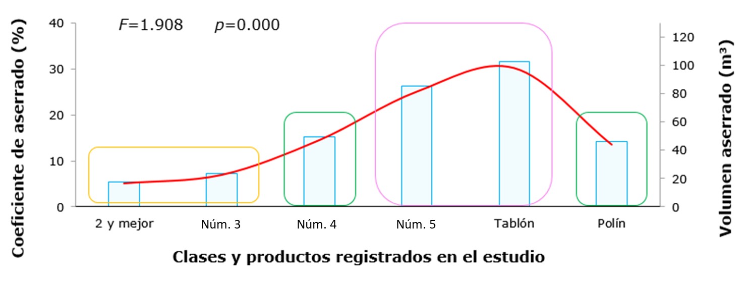 Por su parte, Borz et al. (2021) evaluaron el rendimiento de abeto noruego [Picea abies (L.) H. Karst.] y abeto plateado (Abies alba Mill.) en un aserradero en Rumania, el Coeficiente de aserrado varió entre 38.80 y 95.00 % por troza, con un promedio de aproximadamente 69.00 %; cabe señalar que solo consideraron la producción de madera aserrada (producto primario). La amplia variación de los rendimientos del aserradero rumano se relaciona, principalmente, con la dimensión de la materia prima, debido a que variables como el diámetro y la conicidad influyen significativamente en la productividad.