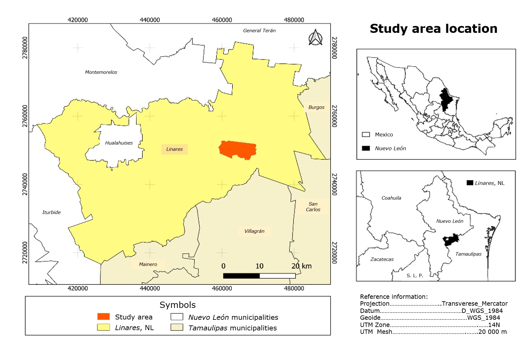 Figure 1. Geographical location of the study site in the Linares municipality, Nuevo León.