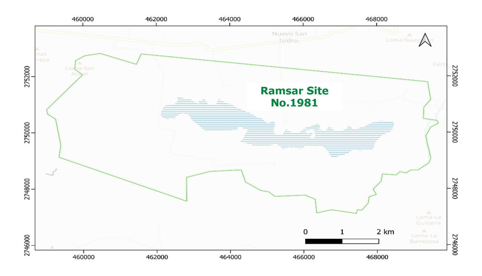 A Raster Tile layer was imported from the Open Street Map (2021) website, which contains the polygon of Ramsar Site No. 1981. In QGIS 3.32.2 (QGIS Development Team, 2021) a vector layer was created vector in ESRI® Shapefile format (.shp) with polygon geometry and WGS 84/UTM Zone 14N projection. In it, the study area was drawn with the "add polygon" tool that was supported by the green lines marked by the OpenStreetMap map (Figure 2).