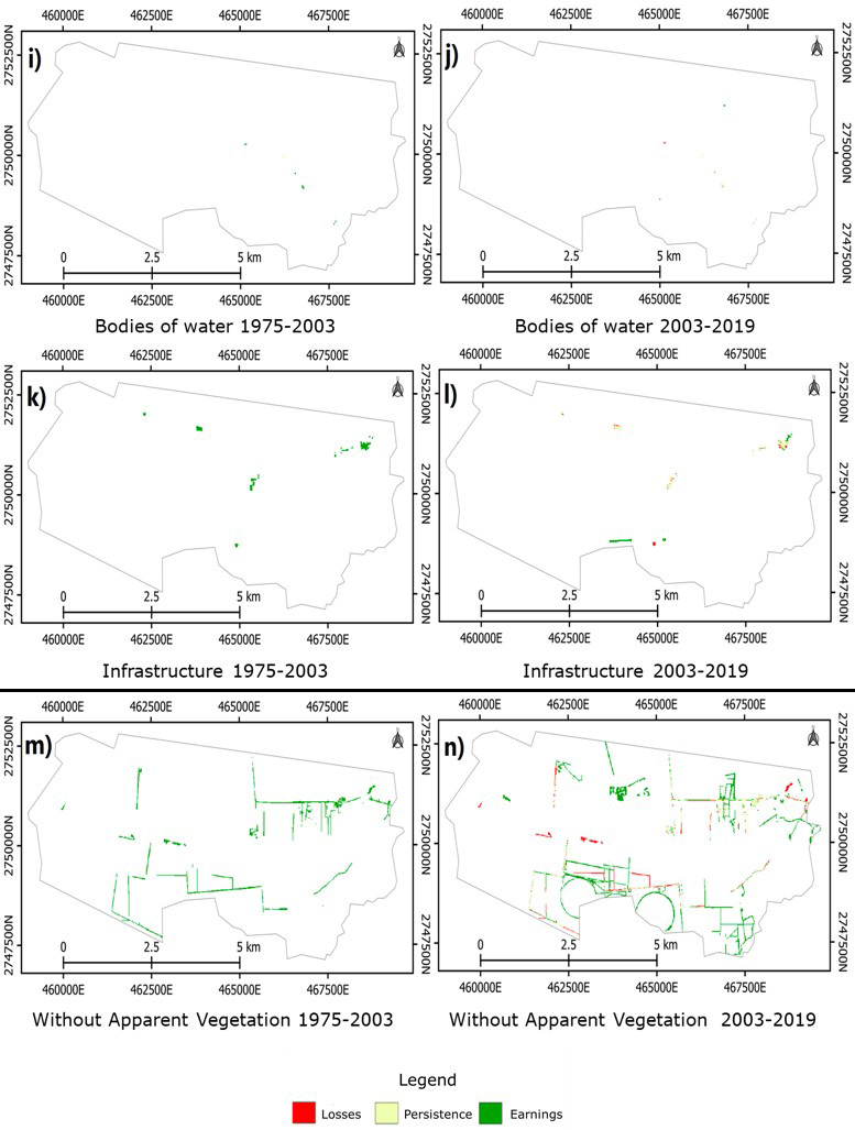 The most outstanding changes are shown in Figure 3. In it, it can be seen that the most notable occur with the loss of scrub cover and floodable area for an increase of the same magnitude in agricultural and grassland areas, respectively; they occur mainly in the period from 1975 to 2003 (Figure 3a-3h). The minimal or little apparent changes are presented in bodies of water, infrastructure and WAP for the periods analyzed (Figure 3i-3n).