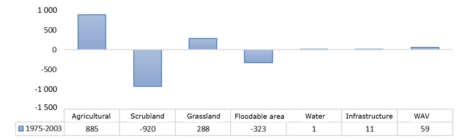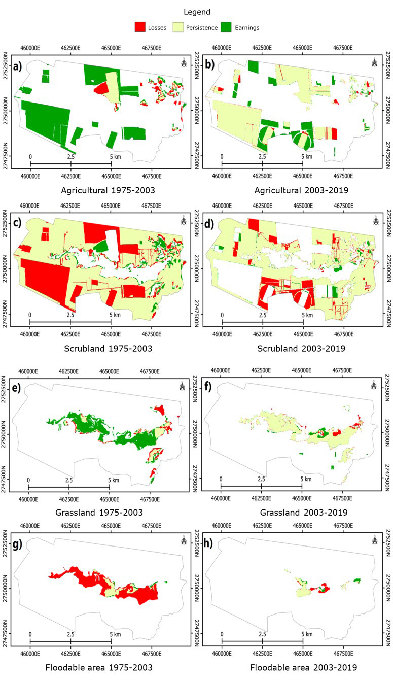 The total changes in coverage that occurred in a period of 44 years (1975-2019) are considerable, as shown in Figure 6. The largest increases occur in agriculture (from 253 to 1 384 ha) and grassland (158 to 448 ha), which contrasts with the notorious loss of scrub (from 3 414 to 2 185 ha) and floodable area (from 400 to 70 ha). Small gains are shown for infrastructure (11 to 14 ha) and water (0.23 to 1 ha).
