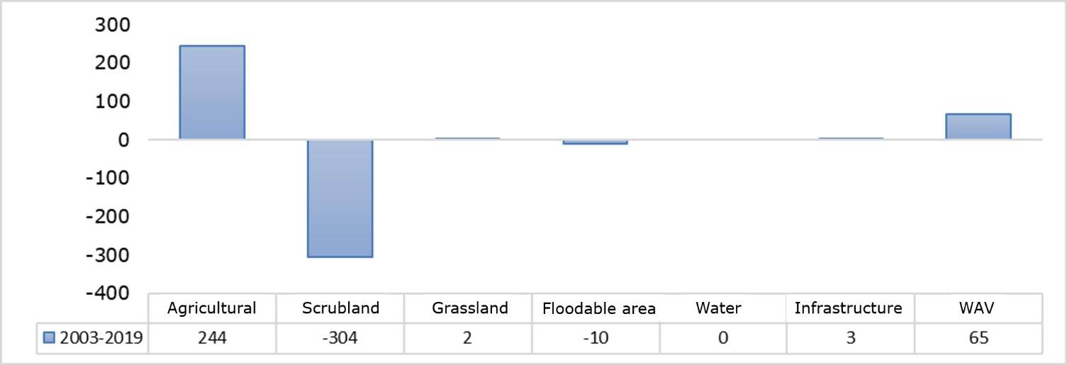 The agricultural expansion continued during the period between 2003 and 2019, with an increase of 7 % and the same proportion of loss for scrubland. The grassland and water remained without significant changes in their coverage, as well as infrastructure and the flood zone (0.22 %), WAV was modified in small amounts (2 %) (Figure 5).