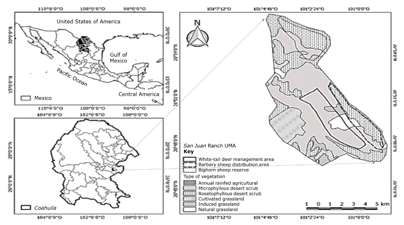 The study was carried out in the 2021-2023 period in the Rancho San Juan Management Unit for the Conservation of Wildlife (UMA), at 26°49´12.34” North and 100°58´43.52” West (Figure 1), which is located 42 km in a straight line east of the city of Monclova, state of Coahuila, Mexico.